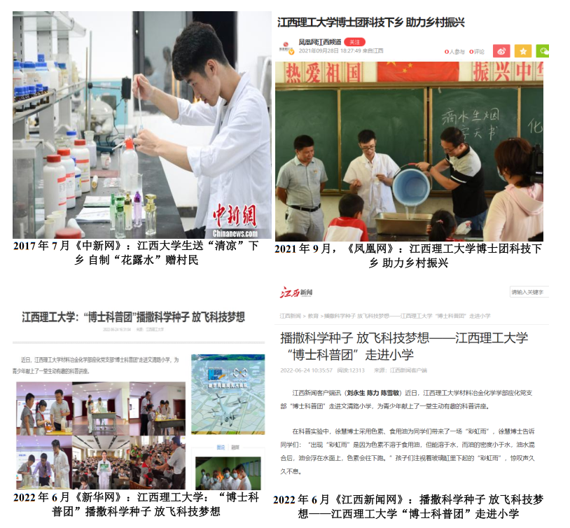该模式被中南大学等十余所高校借鉴;化工安全与实践等系列教材已在多所高校和企业使用;国家级化工冶金实验教学示范中心、江西省工科化学实验教育科普基地等平台受到高度关注;“博士科普团”等活动多次受到新华网、江西教育网等媒体报道,得到广泛赞誉;中国教育报、中央电视台等重要媒体多次报道专业人才培养改革成效。