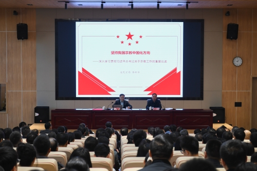 在三江校区启航会议中心2号会议厅召开党委理论学习中心组(扩大)学习会暨“干部培训大讲堂”之宗教工作专题培训。江西省民族宗教事务局党组成员、副局长李新华受邀做题为《坚持我国宗教中国化方向》的专题辅导报告。全体在家校领导、党委常委,学校机关中层干部,各学院(学部)党委书记、副书记、统战委员,全体辅导员、组织员参加培训。培训会由校党委书记杨斌主持。