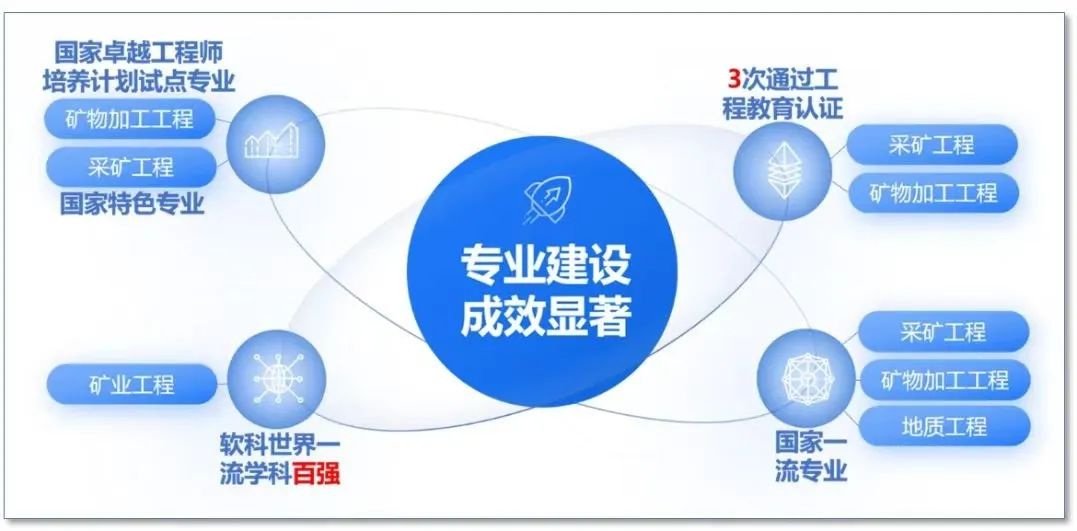 采矿、矿加、地质3个专业获批国家一流专业建设点,采矿、矿物加工为国家卓越工程师培养计划试点专业。获国家级一流课程1门、江西省一流课程7门。建成国家级、省部级等科教/产教平台14个。教师获评宝钢优秀教师、全国高校辅导员年度人物提名、全国教材建设先进个人等荣誉120多项,获批省级高水平本科教学团队3个。