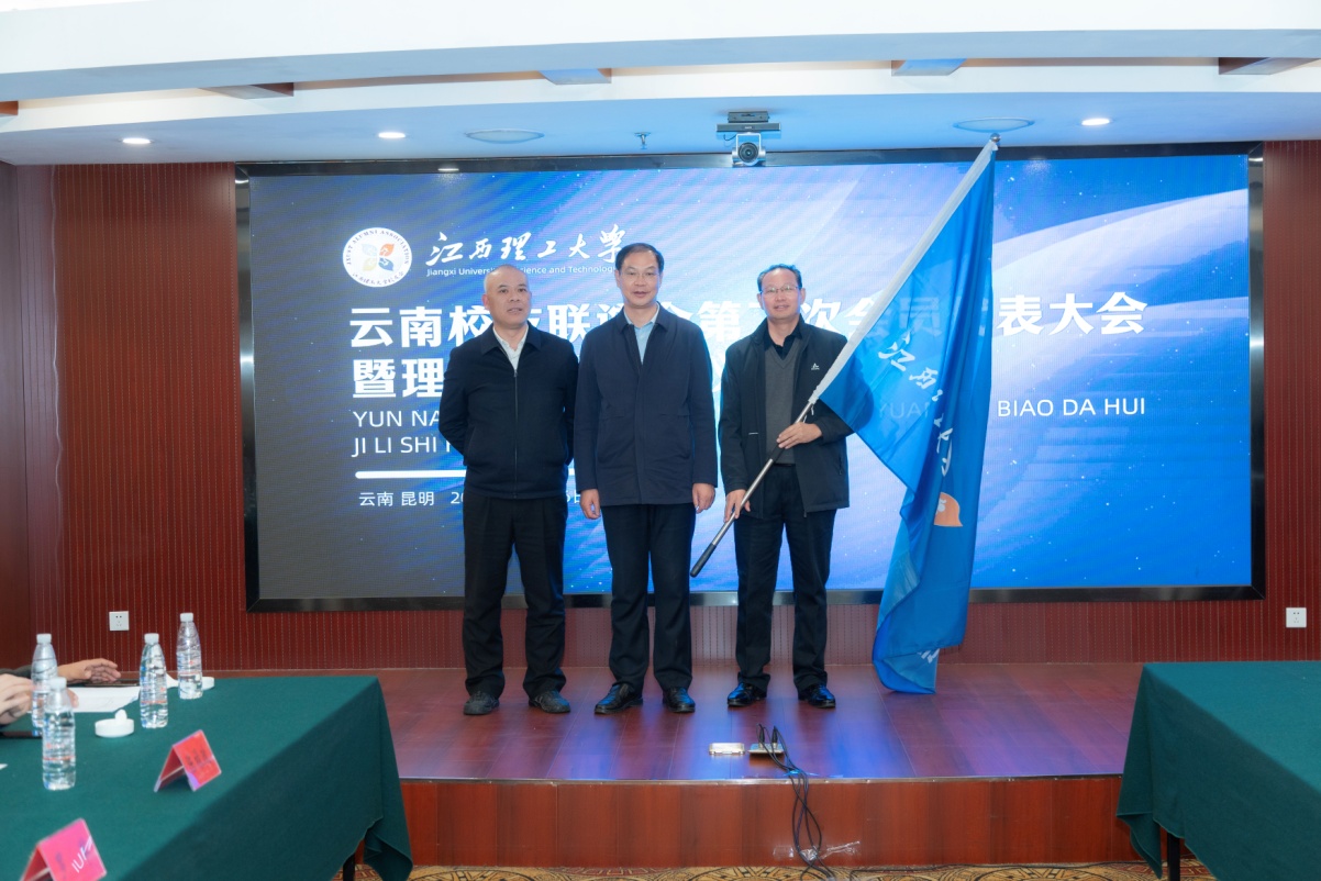 廖春发向郭辉如授旗并从综合实力、办学条件、学科建设、人才培养、科技创新、服务社会等方面介绍学校近年来发展情况。廖春发对云南校友联谊会提出三点工作要求:一是希望云南校友工作加温度。发挥桥梁纽带作用,持续加强沟通联系,用心用情服务好在滇校友,共同建设好云南校友之家。二是希望云南校友工作深广度。充分搭建好、充实好校友平台功能,打好“地方+学校+校友”的资源共享、优势互补、人员互通的“组合拳”,为母校的发展、校友会的发展、校友的发展提供更加坚实的助力。三是希望云南校友工作提高度。积极服务于国家战略部署,将校友工作与推动云南加快建设面向南亚东南亚辐射中心定位紧密结合起来、将校友发展与当地经济社会发展紧密结合起来,为国家建设、地方经济社会发展贡献出江理的智慧与力量。最后,廖春发向广大校友发出了“请校友回母校”的邀请。