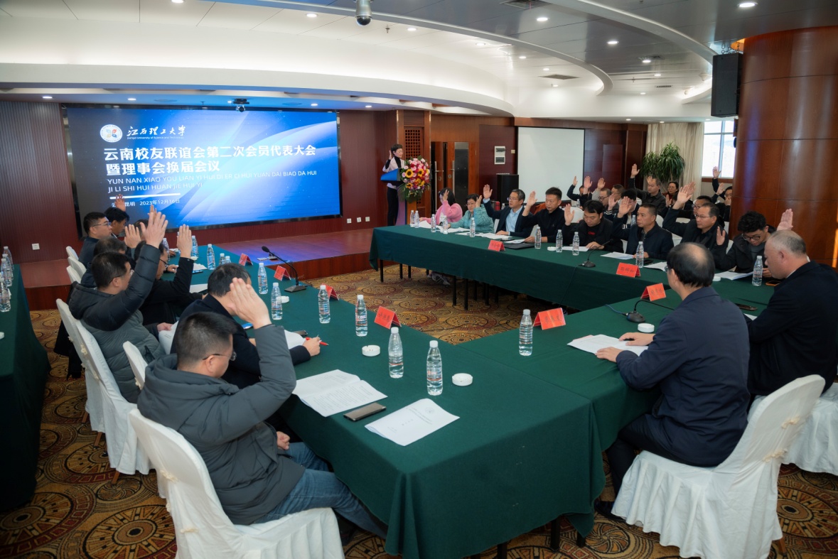 云南校友联谊会相关管理规章制度;通报了候选人产生情况,选举产生了第二届理事会组织机构人员。其中,选矿1990届校友赖秀栋当选为名誉会长,有色金属冶金1991届校友郭辉如当选为会长,工程造价1998届校友罗军、选矿2001届校友陈禄政当选为常务副会长,选矿1999届校友杨金雷当选为副会长兼秘书长。