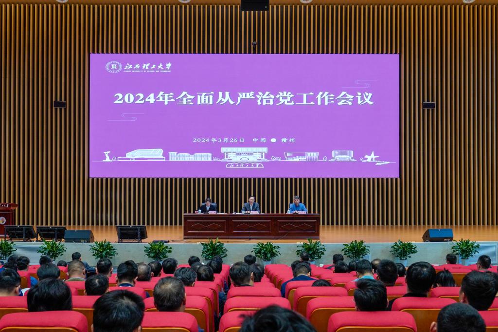 2024年全面从严治党工作提出了五点要求。一是要坚持旗帜鲜明讲政治,用实际行动践行“两个维护”。坚持不懈用党的创新理论凝心铸魂,坚持党对学校工作的全面领导,坚决扛起巡视整改政治责任,坚决落实省委工作要求。二是要坚持贯彻新时代党的组织路线,打造高素质干部人才队伍。提升双融双育实效,强化党建品牌建设,坚持党对统战群团工作的集中统一领导,打造一支忠于党的教育事业、敢于担当、甘于奉献的高素质干部人才队伍。三是要坚持一体推进“三不腐”,持之以恒强化正风肃纪。加强对“一把手”和领导班子的监督,坚持纠树并举深化作风建设,突出严的基调强化纪律建设。四是要全面落实立德树人根本任务,牢牢守住教育安全稳定底线。持续完善“三全育人”工作体系,全面落实意识形态工作责任制,扎实开展心理健康促进专项行动。五是要以全面从严治党的实际成效引领推动学校事业高质量发展。聚焦学校年度工作要点明确的“一个中心”“五个重点”“八个方面”工作,继续推进“人才、质量、开放”三大战略,加快建设“忠诚江理、卓越江理、幸福江理、平安江理、团结江理、勤廉江理”。杨斌强调,全校上下要坚持以习近平新时代中国特色社会主义思想为指导,要深入学习贯彻习近平总书记关于党的自我革命的重要思想和考察江西重要讲话精神,全面贯彻中央纪委、省纪委和教育系统相关会议精神和工作要求,切实把思想和行动统一到习近平总书记关于党的自我革命的重要思想上来。