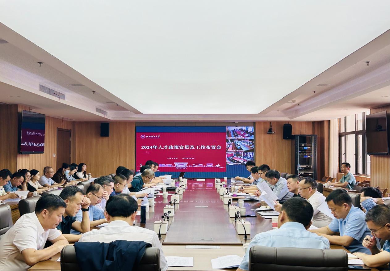 2024年人才政策宣贯及工作布置会在三江校区濂溪楼2号会议室召开。校党委副书记罗仙平,校党委常委、党委组织部部长刘志刚出席会议,各学院人才工作负责人参加会议。