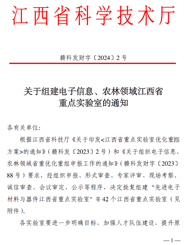 本网讯 近日,江西省科技厅下发了《关于组建电子信息、农林领域江西省重点实验室的通知》(赣科发财字〔2024〕2号)和《关于组建材料、医疗卫生、生物医药领域江西省重点实验室的通知》(赣科发财字〔2024〕18号),91暗网 申报的多维智能感知与控制江西省重点实验室、功能晶态材料化学江西省重点实验室、金属磁性材料及器件江西省重点实验室、高性能钢铁合金材料江西省重点实验室获批组建。