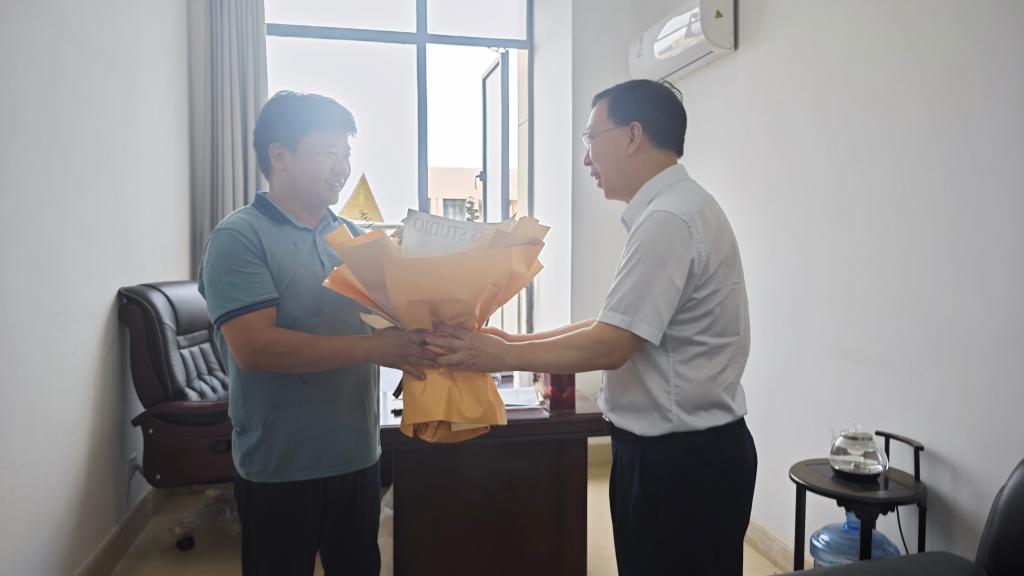 “丰教授辛苦了,感谢你坚守一线岗位,为学校的建设与发展辛勤工作……”杨斌代表学校向丰土根教授送上鲜花并致以诚挚慰问。他亲切询问了丰土根教授的工作和生活情况,详细了解了他在教育、教学、科研、管理和服务等方面的进展;对他在工作中为学校发展作出的积极贡献和行业领域取得的成绩给予充分肯定,并认真听取他对学校发展的意见和建议;希望他继续发挥自身优势,牢记立德树人初心,践行为党育人为国育才使命,发挥先锋作用,为学校加快建设“综合实力全国一流、行业引领作用突显、特色领域国际领先的高水平大学”添砖加瓦。