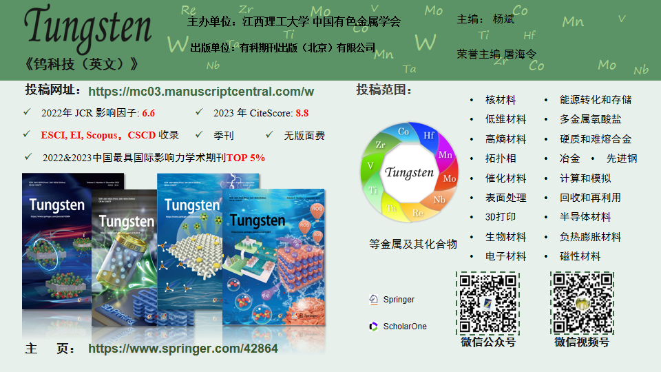 Tungsten创刊于2019年,旨在发表钨、钼、钴、钒、钽、铌、铼、锆、铪、锰、钛等金属及化合物的高水平学术论文。期刊刊文范围包含但不限于以下领域:核材料、能源转换与存储、低维材料、多金属氧酸盐、高熵合金、拓扑材料、负热膨胀材料、催化材料、硬质和难熔合金、生物医用材料、电子材料、先进冶金工艺、表面处理、3D打印、计算与模拟、回收和再利用。