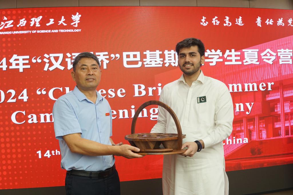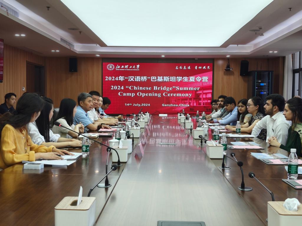 本网讯 7月14日上午,2024年“汉语桥”巴基斯坦学生夏令营开营仪式在濂溪楼2号会议室举行。巴基斯坦旁遮普大学、拉合尔工程管理大学、阿拉马伊克巴勒开放大学和拉合尔爱奇森学院的共20名巴基斯坦师生参加此次夏令营。校党委常委、副校长龚姚腾,孔子学院中方院长兼国际交流与合作中心主任蔡进宝,国际教育学院副院长肖静,体育与艺术学院副院长黄丽娜及相关教师出席仪式。