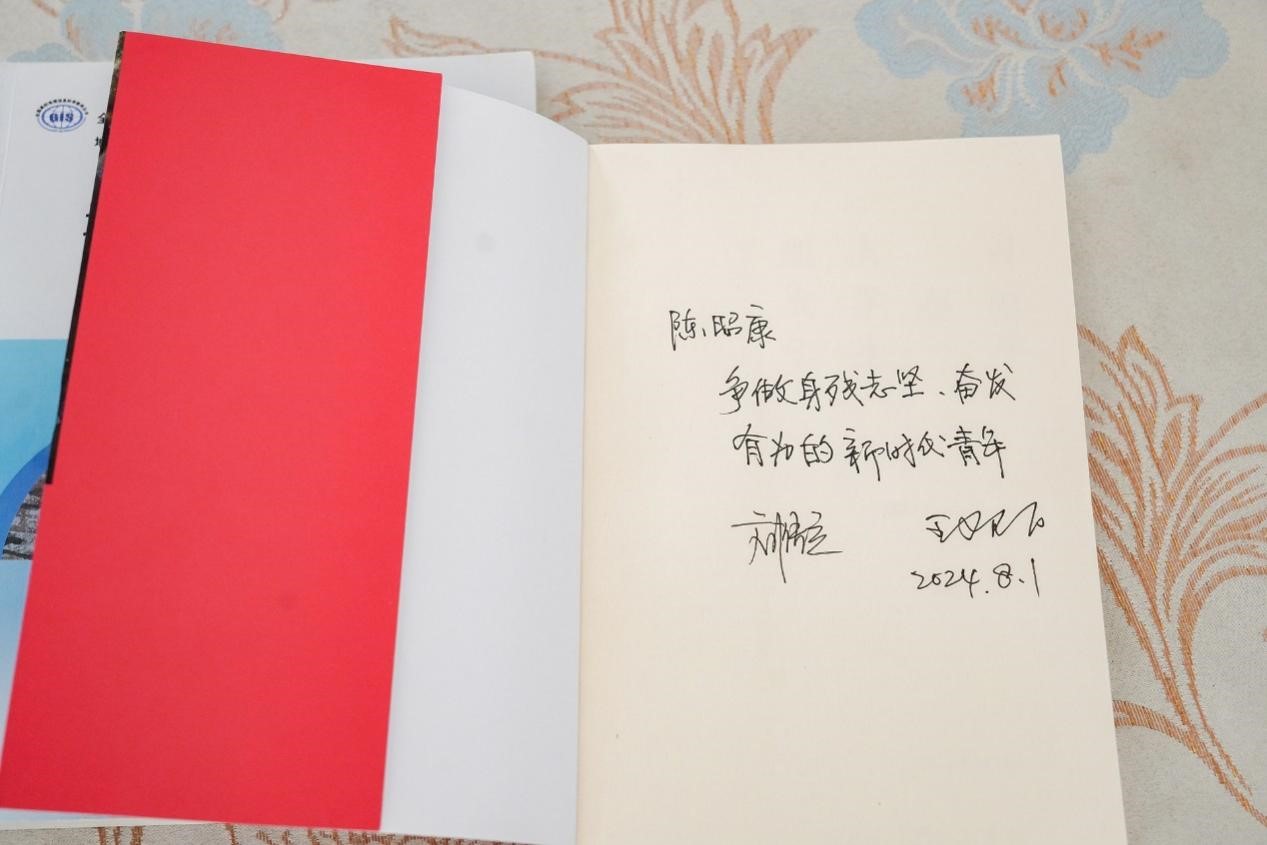学院还特别给陈昭康准备了一份礼物——《习近平与大学生朋友们》和《地理信息科学导论》两本书籍。“争做身残志坚,奋发有为的新时代新年!”在《习近平与大学生朋友们》一书扉页上,学院书记和院长共同寄语并亲笔签名,希望他向书中的无臂大学生黄道亮学习,身残志坚,以非凡的毅力克服重重困难,成为新一代地理信息科学的创新人才,在奋斗中实现自己的青春梦想。