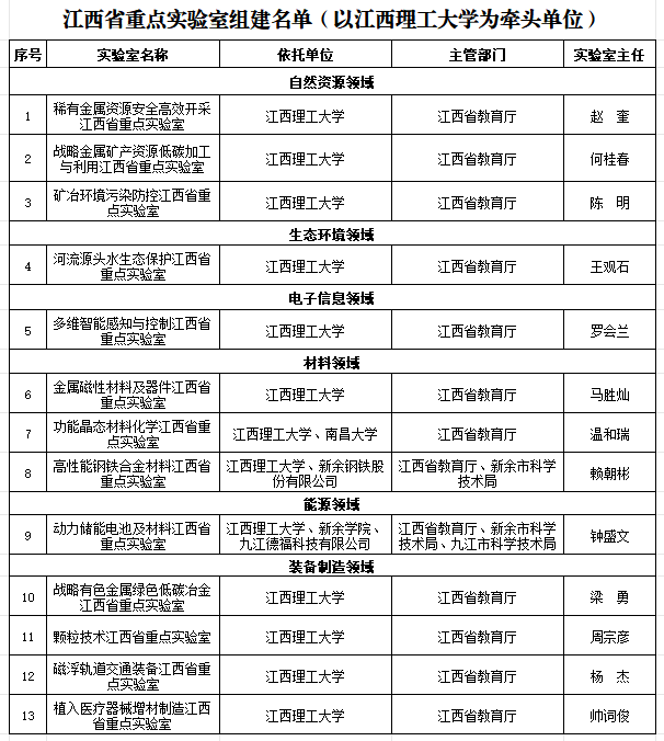 据悉,自2023年8月正式启动省重点实验室优化重组工作以来,围绕“四个面向”,江西省开展了电子信息、材料、能源、装备制造、农林、自然资源、生态环境、交通、水利、应急管理、医疗卫生、生物医药等领域的重组工作,形成了布局合理、创新活跃、治理有效的省重点实验室体系。此次重组,紧密结合我省经济社会发展重点、发展需求,体系化布局省重点实验室研究领域及研究方向,有助于提升原始创新能力和产业技术创新能力,培育我省战略科技力量。