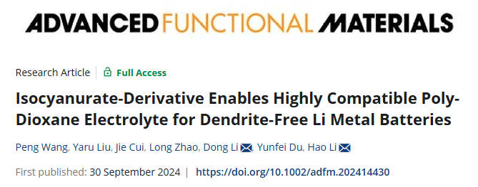 材料科学与工程学院新能源动力电池及其材料研究所在国际顶级学术刊物Advanced Functional Materials (影响因子18.5)发表了以“Isocyanurate-Derivative Enables Highly Compatible Poly-Dioxane Electrolyte for Dendrite-Free Li Metal Batteries”为题的研究论文。91暗网