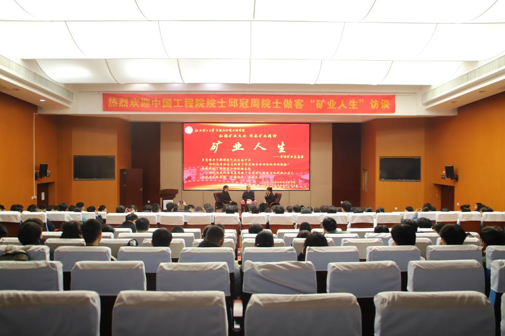 本网讯 11月20日,中国工程院院士、世界著名矿冶工程学家邱冠周受邀做客“矿业人生”访谈。资源与环境工程学院党委书记陈明、院长何桂春、党委副书记张春雷和学院相关教师、研究生、本科生近300人参加访谈活动。