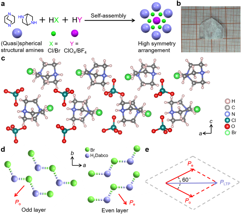有机-无机杂化分子材料具有丰富的结构自由度,允许局部偶极子的各种立体取向,为实现非共线性电极化提供了分子基础。缪等设计了有机-无机杂化分子晶体(DABCO)2BrClO4,其中含有层状排列的偶极Br···[H2Dabco]氢键链(图1)。研究表明,由于氢键是弱相互作用,同一层中Br···[H2Dabco]可以形成相互转化的极化方向不同的氢键链。在室温时,只出现互为60°扭转角的两种氢键链层,晶体表现铁电的自发极化(图1d); 而在较高温度时,新的氢键链重新形成,晶体中出现互为60°扭转角的六种极化方向的氢键链,自发极化消失;然而这些氢键链能在电场下转化为只有两种偶极方向氢键链,表现出反铁电行为 (图2)。不同于通常的铁电体和反铁电体,该分子晶体的铁电相和反铁电相中偶极子是非共线的。这种独特的电极化开关模式导致低的郊顽场,在信息存储器件领域显示应用潜力。该研究不但揭示了非共线极化的独特科学意义,也为寻找丰富的非共线极化提供了有效途径。