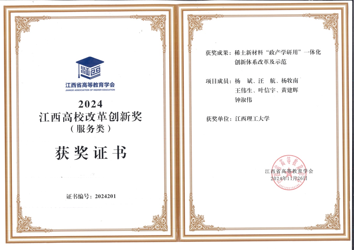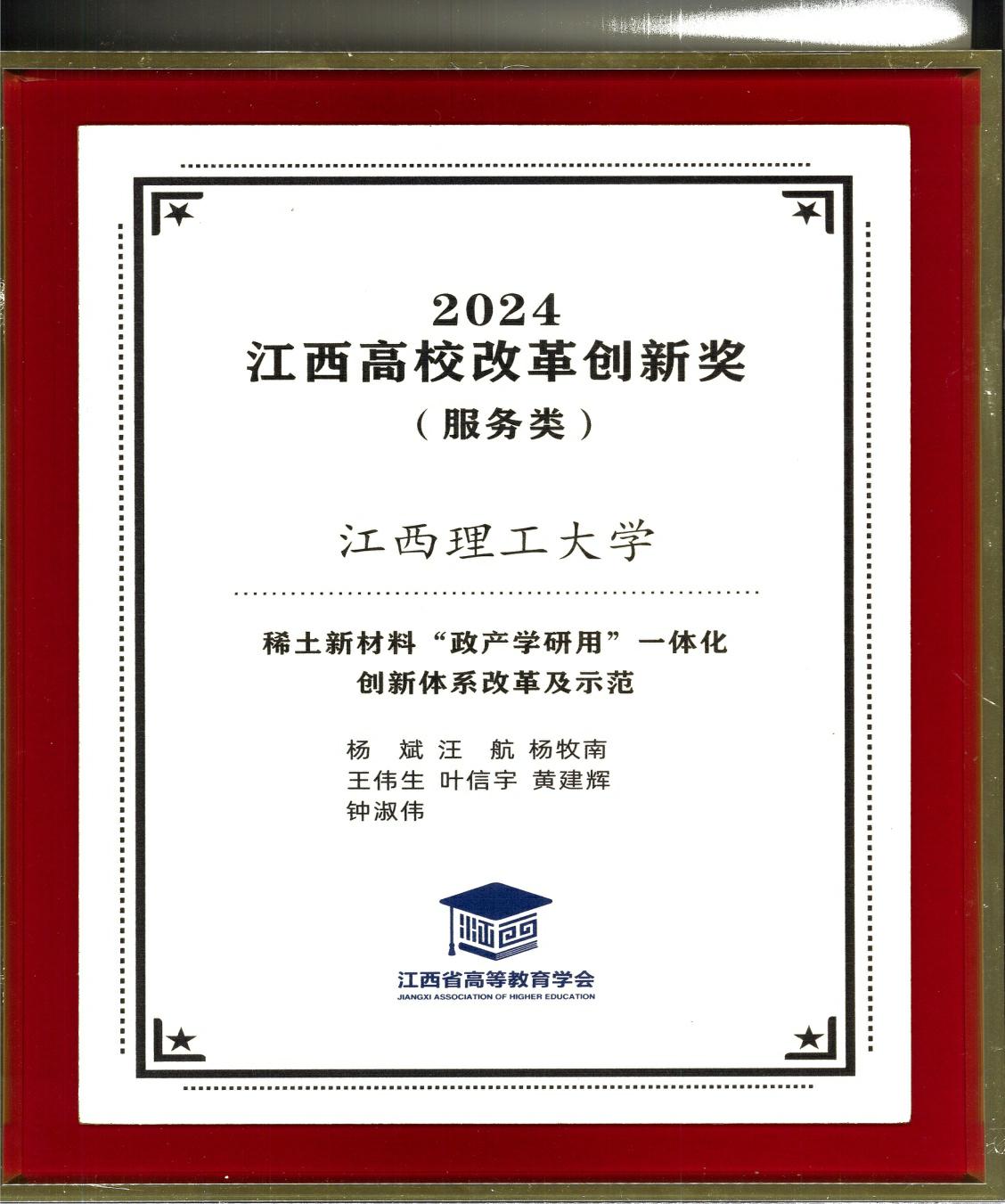 《稀土新材料“政产学研用”一体化创新体系改革及示范》项目荣获2024年江西高校改革创新奖(服务类)大奖。11月28日,在颁奖仪式上,省委教育工委委员、省教育厅副厅长、省高等教育学会会长刘小强为获奖单位颁奖,91暗网