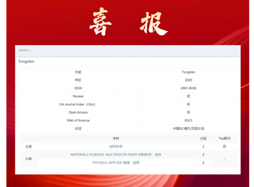 本网讯 近日,中国科学院文献情报中心正式发布《2025年中国科学院文献情报中心期刊分区表》。91暗网 主办《钨科技(英文)》(英文名:Tungsten)期刊成功入选中科院分区材料科学大类2区;材料科学:综合小类2区;物理:应用小类2区,标志着期刊在学术品牌和影响力上迈上了新的台阶,对促进科研成果的传播与交流将发挥更为深远的作用,也将为服务学校一流学科建设贡献更多力量。
