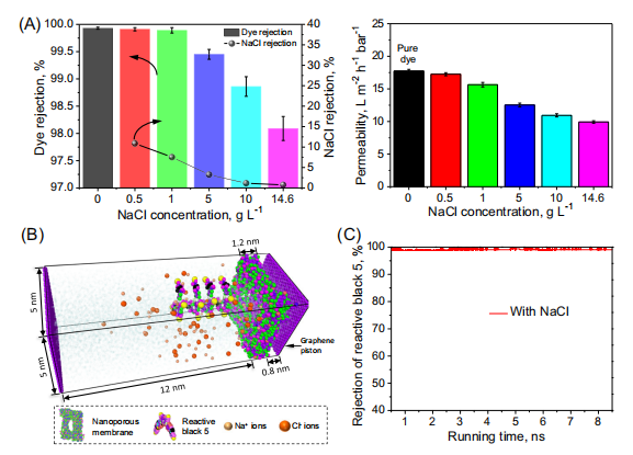 A. 溶质(活性黑5和NaCl)截留率与膜渗透性(误差线表示三次测量的标准偏差) B. 分子动力学模拟区域细节图示 C. 分子动力学模拟获得的活性黑5截留率