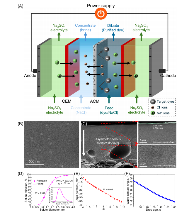 该研究证实,采用亚4纳米多孔膜作为阴离子传导膜,能够突破传统技术的局限,实现高盐染料废液中活性染料与NaCl的高效一步分离。该成果不仅为纳米多孔阴离子传导膜替代易污染的传统阴离子交换膜提供了概念验证,更为实现染料纯化与盐分回收的协同处理开辟了新途径。
