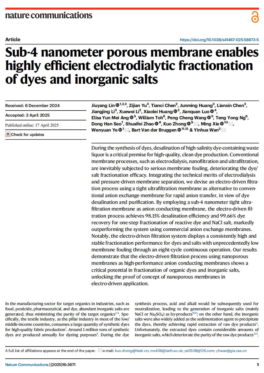 作为第一通讯单位,在《Nature》子刊《Nature Communications》上发表了题为“Sub-4 nanometer porous membrane enables highly efficient electrodialytic fractionation of dyes and inorganic salts”的研究成果。