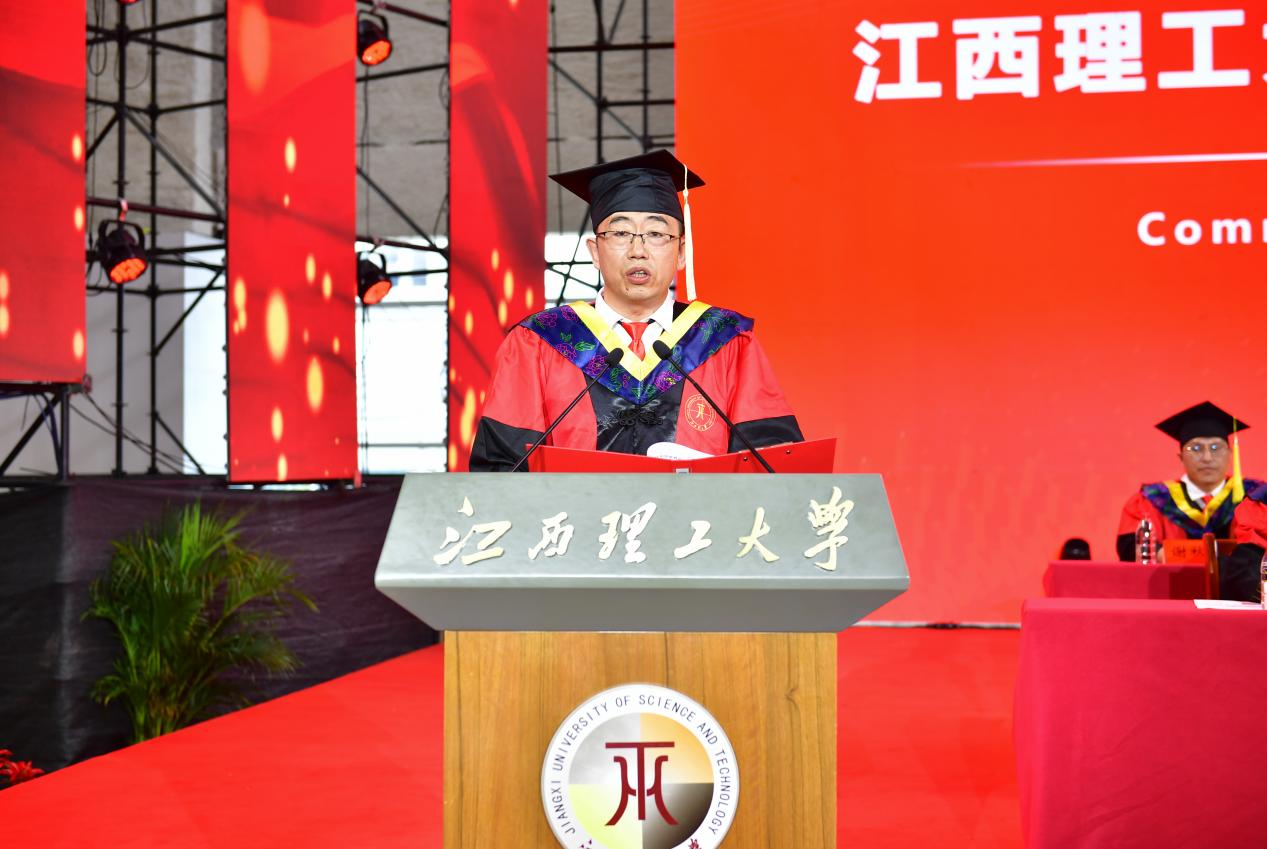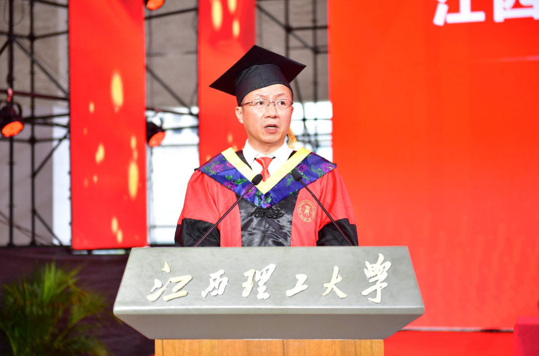 在毕业生们即将踏上崭新的人生旅程之际,葛世荣向同学们分享三点感悟。一是回首来时路,红色基因是江理人永不褪色的精神底色。学校扎根这片浸透烈士鲜血的土地,将红色基因融入办学血脉,一批又一批的江理学子用“到祖国最需要的地方去”的生动实践,诠释了植根在历史积淀中的家国情怀。二是细数成长路,有色根基是江理人刻骨铭心的青春记忆。学校因钨而生、因铜而兴、因稀土而强、因锂电而盛,江理学子骨子里流淌的“有色”血液,是江理人拼搏奋进的内驱动力,“矿业报国”的有色根基,早已刻入江理学子的DNA。三是展望未来路,出色成果是江理人践行誓言的时代答卷。身处世界百年未有之科技大变局,江理人要沿着杰出校友的足迹,让青春在中国式现代化征程中绽放,以使命作墨,用担当为笔,在未来征程上绘就出色成果画卷,成就出色人生。