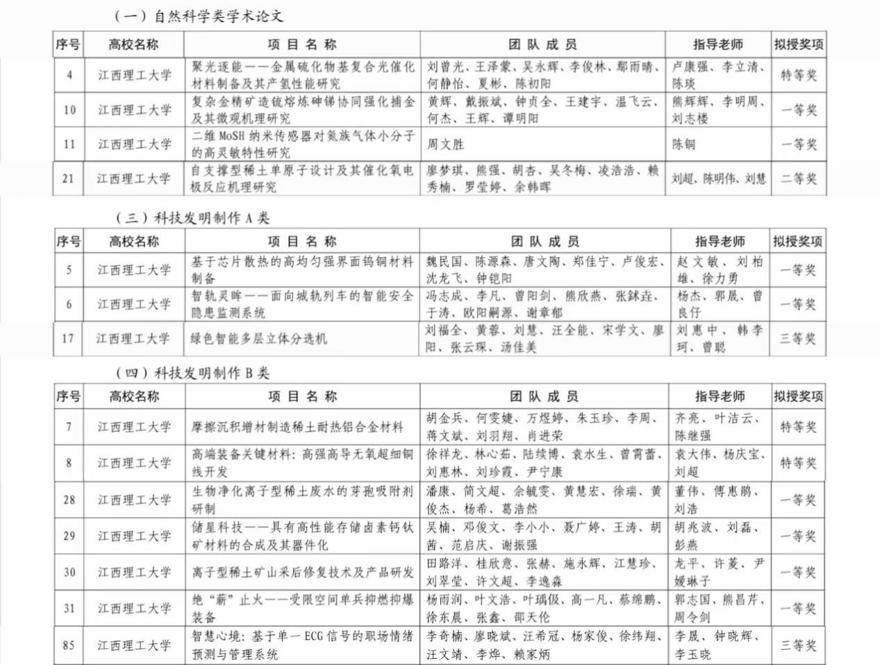 其中《聚光逐能——金属硫化物基复合光催化材料制备及其产氢性能研究》(推荐单位:化学化工学院)、《摩擦沉积增材制造稀土耐热铝合金材料》(推荐单位:材料科学与工程学院)《高端装备关键材料:高强高导无氧超细铜线开发》(推荐单位:先进铜产业学院)3个参赛作品荣获特等奖。《基于芯片散热的高均匀强界面钨铜材料制备》(推荐单位:材料科学与工程学院)、《生物净化离子型稀土废水的芽孢吸附剂研制》(推荐单位:资源与环境工程学院)、《复杂金精矿造铳熔炼砷锑协同强化捕金及其微观机理研究》(推荐单位:冶金工程学院)、《智轨灵眸——面向城轨列车的智能安全隐患监测系统》(推荐单位:电气工程与自动化学院)、《储星科技——具有高性能存储卤素钙钛矿材料的合成及其器件化》(推荐单位:化学化工学院)、《离子型稀土矿山采后修复技术及产品研发》(推荐单位:土木与测绘工程学院)、《二维MoSH纳米传感器对氮族气体小分子的高灵敏特性研究》(推荐单位:能源与机械工程学院)、《绝“薪”止火——受限空间单兵抑燃抑爆装备》(推荐单位:应急管理与安全工程学院)8个参赛作品荣获一等奖。《自支撑型稀土单原子设计及其催化氧电极反应机理研究》(推荐单位:稀土学院)1个参赛作品荣获二等奖、《绿色智能多层立体分选机》(推荐单位:机电工程学院)、《智慧心境:基于单一ECG信号的职场情绪预测与管理系统》(推荐单位:理学院)2个参赛作品荣获三等奖。