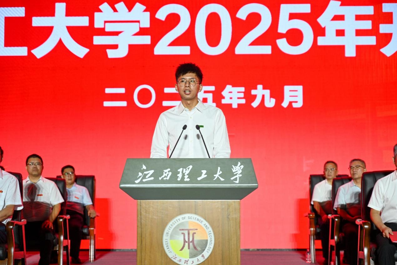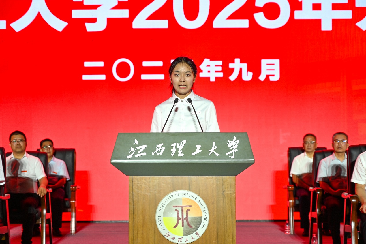 本科新生代表、化学化工学院高昕妤同学表达了初入校园的激动与对未来的憧憬。她谈到,大学是探索自我的舞台,是提升自我的重要阶段,更是淬炼自我的成长熔炉!她与全体新生共勉在大学里学会坚韧,反思与成长,在江理这片热土上携手前行。