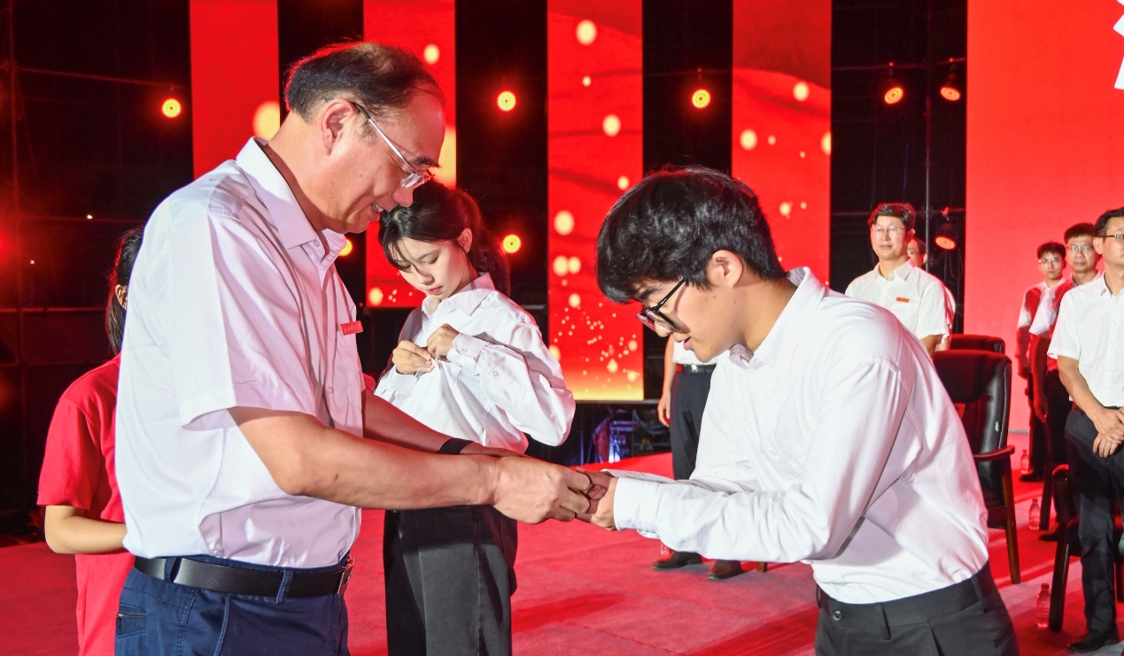 典礼上,全体同学进行了校徽佩戴仪式,校领导为新生代表逐一佩戴校徽。