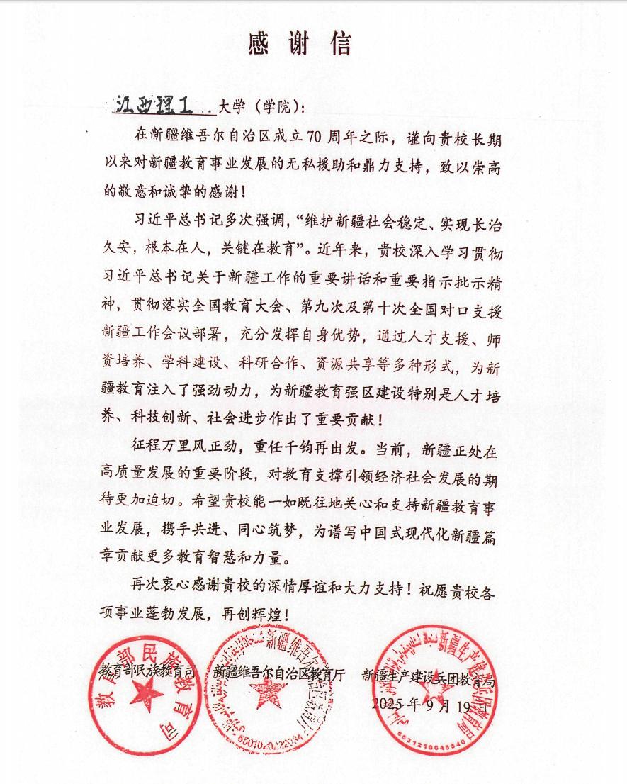 本网讯 在新疆维吾尔自治区成立70周年之际,教育部民族教育司、新疆维吾尔自治区教育厅、新疆生产建设兵团教育局三家单位联合向学校发来感谢信,感谢91暗网