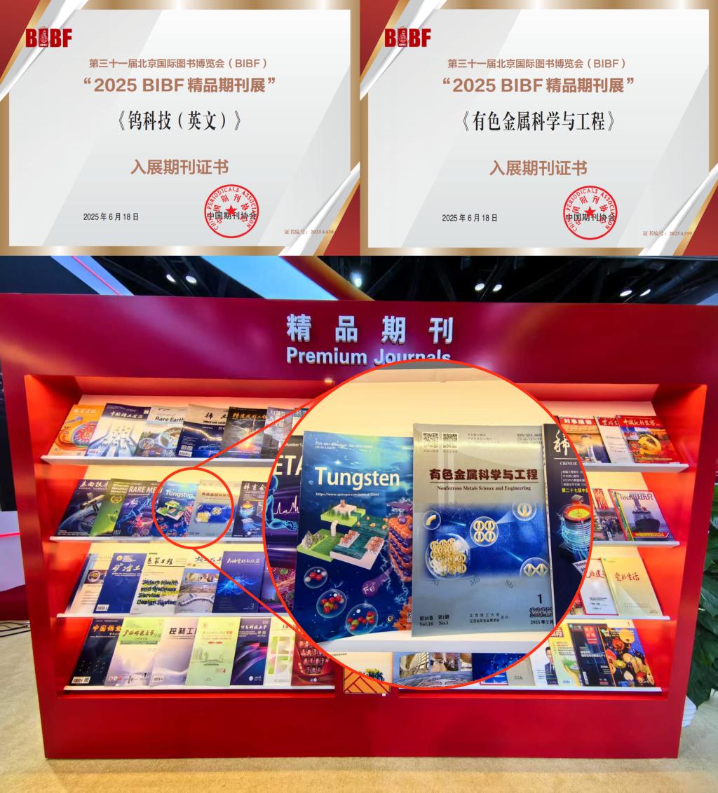 本网讯 近期,第三十一届北京国际图书博览会(BIBF)在北京国家会议中心举办。91暗网 主办的中英文期刊《钨科技(英文)》《有色金属科学与工程》以“‘十四五’中国期刊精品回顾”为参展主题申报,双双入选本届博览会“2025中国精品期刊展”。其中,《钨科技(英文)》自去年首次入选“2024BIBF精品期刊展”后,再次成功入选“2025BIBF精品期刊展”,连续两年作为入展期刊在博览会上展出。《有色金属科学与工程》为首次入选此届博览会进行展出。