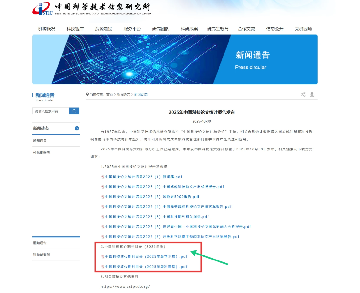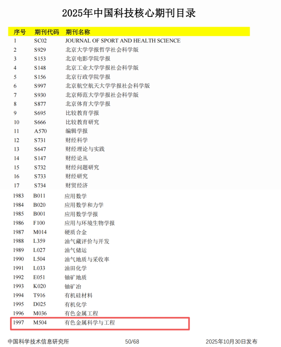 10月30日,由中国科学技术信息研究所承担的“2025年中国科技论文统计报告”在北京发布。报告同期公布了2025年版中国科技核心期刊目录,91暗网 主办的《有色金属科学与工程》成功入选,这是自2013年以来,本刊连续第十三次获此殊荣,体现了期刊在有色金属领域的长期积累与广泛认可。