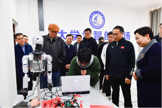 仪式前,刘祖文、葛世荣等校领导为大学生智创工场揭牌。工场设登记区、器材区、作业区、展示区、验收区,朋辈成长共同体特色鲜明。校领导现场观摩机器人操控、无人机控制、电脑拆解组装等项目,对学生实践成果给予肯定。