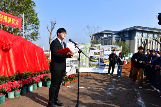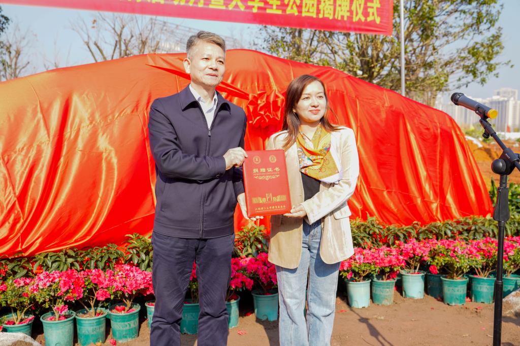 揭牌仪式上,刘祖文、葛世荣、周朝炊及学生代表张凤瀛共同为大学生公园揭牌。校党委常委、副校长董冰岩为厦门校友联谊会颁发捐赠证书,感谢校友捐赠精美石牌与两棵桂花树,为大学生公园增添文化底蕴和绿色生机。