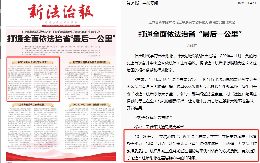 各地因地制宜,不断拓展学习宣传贯彻习近平法治思想的广度、深度。部分设区市跟进建立本地“习近平法治思想大学堂”师资库。新余市开设“学习贯彻习近平法治思想笔谈”专栏,刊发45位县(区)和市直单位党政主要负责人学习心得体会。