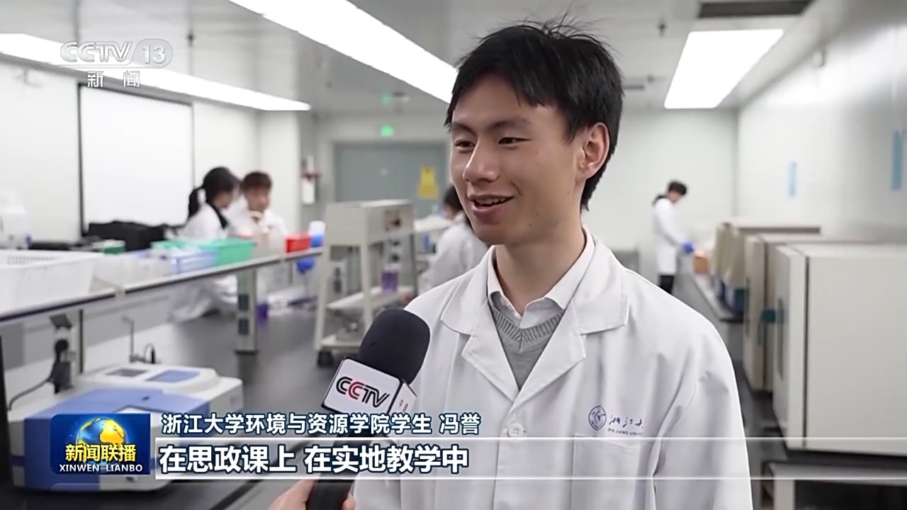 浙江大学环境与资源学院学生 冯誉:在思政课上,在实地教学中,我深切感受到践行绿水青山就是金山银山的理念,我们的天更蓝、水更清,空气也更新鲜了。这也让我更加树立了专业信心,我要努力增强专业本领,未来为建设人与自然和谐共生的美丽中国贡献青春力量!
