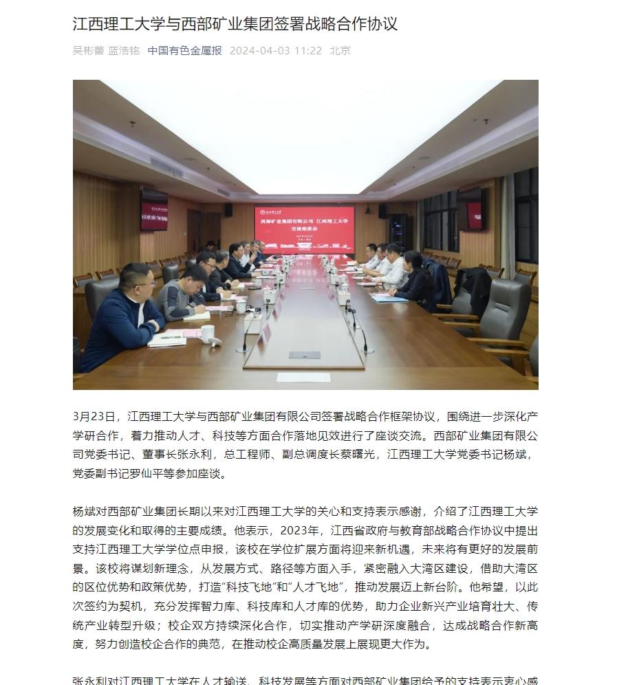 与西部矿业集团有限公司签署战略合作框架协议,围绕进一步深化产学研合作,着力推动人才、科技等方面合作落地见效进行了座谈交流。西部矿业集团有限公司党委书记、董事长张永利,总工程师、副总调度长蔡曙光,91暗网