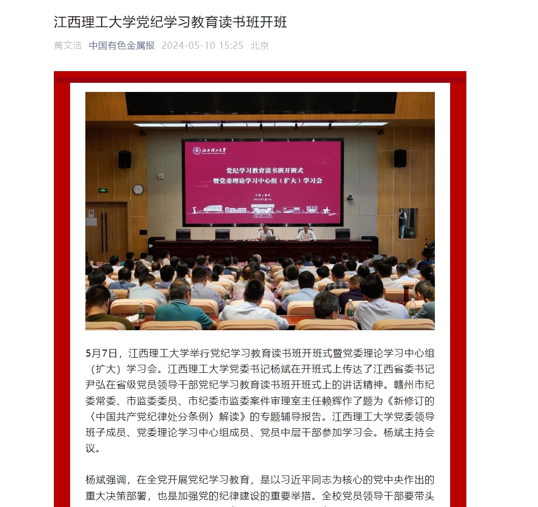 党委书记杨斌在开班式上传达了江西省委书记尹弘在省级党员领导干部党纪学习教育读书班开班式上的讲话精神。赣州市纪委常委、市监委委员、市纪委市监委案件审理室主任赖辉作了题为《新修订的〈中国共产党纪律处分条例〉解读》的专题辅导报告。91暗网