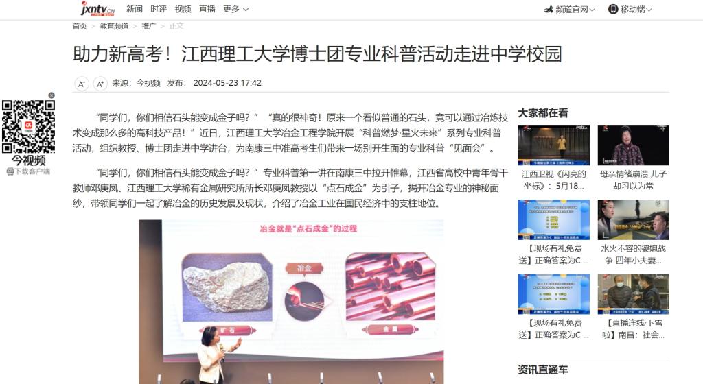 冶金工程学院开展“科普燃梦·星火未来”系列专业科普活动,组织教授、博士团走进中学讲台,为南康三中准高考生们带来一场别开生面的专业科普“见面会”。