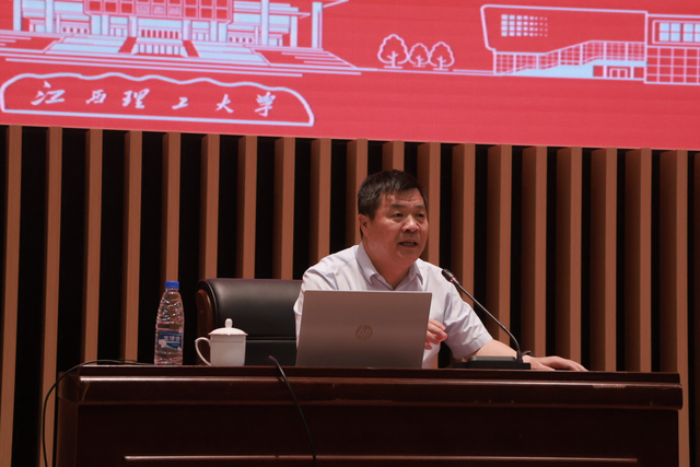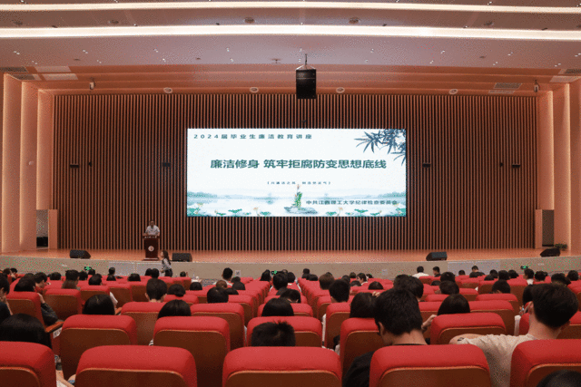 2024届全体毕业生齐聚一堂,江西省药学会医院药学专业委员会副主任委员徐小军在这里开展以“奔赴山海 不负热爱”为题的廉洁教育。通过鲜活生动的廉政教育为学子筑牢廉政之魂,用“三维六方”红色育人体系为学子扎牢理想信念的根。