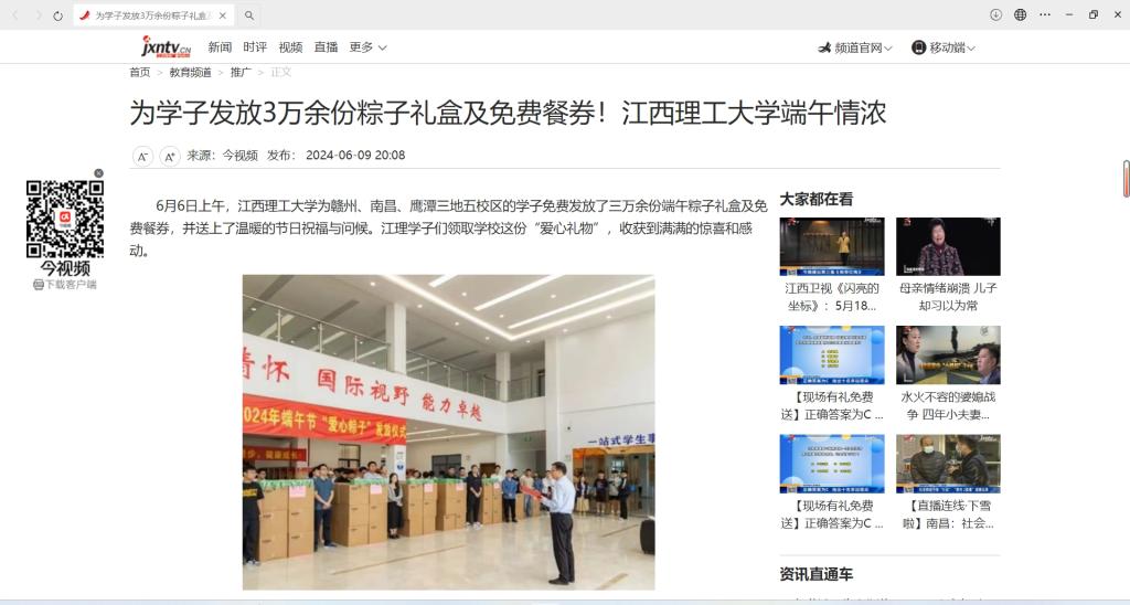为赣州、南昌、鹰潭三地五校区的学子免费发放了三万余份端午粽子礼盒及免费餐券,并送上了温暖的节日祝福与问候。江理学子们领取学校这份“爱心礼物”,收获到满满的惊喜和感动。
