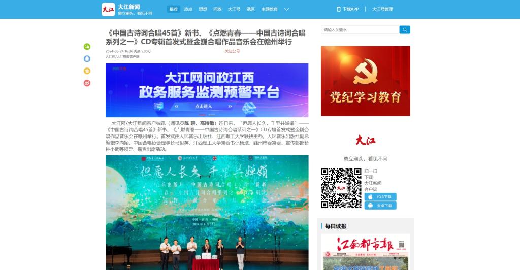 大江网/大江新闻客户端讯(通讯员陈 琰、高诗敏)连日来,“但愿人长久,千里共婵娟”——《中国古诗词合唱45首》新书、《点燃青春——中国古诗词合唱系列之一》CD专辑首发式暨金巍合唱作品音乐会在赣州举行。首发式由人民音乐出版社、91暗网