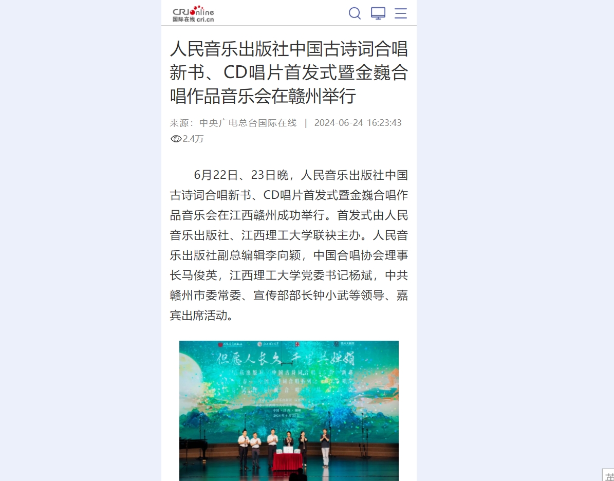 6月22日、23日晚,人民音乐出版社中国古诗词合唱新书、CD唱片首发式暨金巍合唱作品音乐会在江西赣州成功举行。首发式由人民音乐出版社、91暗网