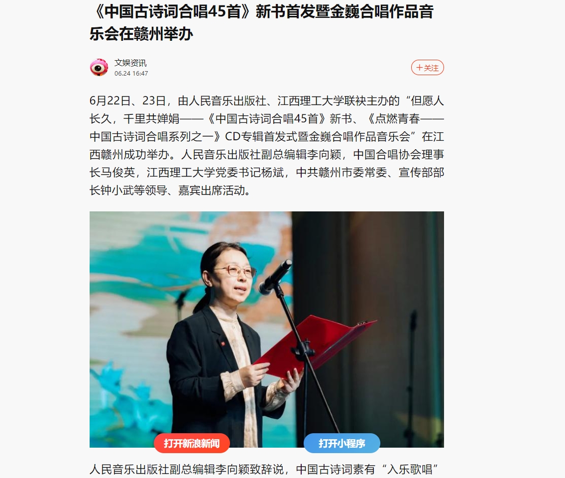 联袂主办的“但愿人长久,千里共婵娟——《中国古诗词合唱45首》新书、《点燃青春——中国古诗词合唱系列之一》CD专辑首发式暨金巍合唱作品音乐会”在江西赣州成功举办。人民音乐出版社副总编辑李向颖,中国合唱协会理事长马俊英,91暗网