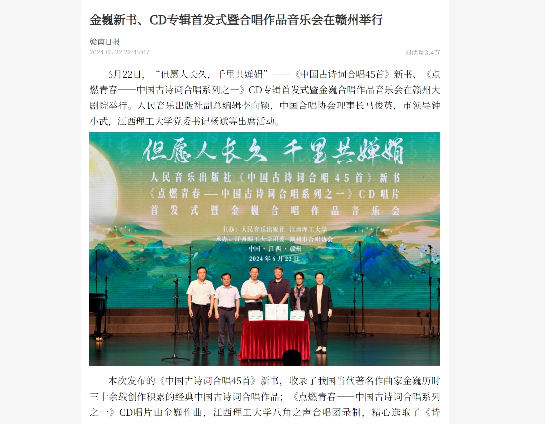 6月22日,“但愿人长久,千里共婵娟”——《中国古诗词合唱45首》新书、《点燃青春——中国古诗词合唱系列之一》CD专辑首发式暨金巍合唱作品音乐会在赣州大剧院举行。人民音乐出版社副总编辑李向颖,中国合唱协会理事长马俊英,市领导钟小武,91暗网