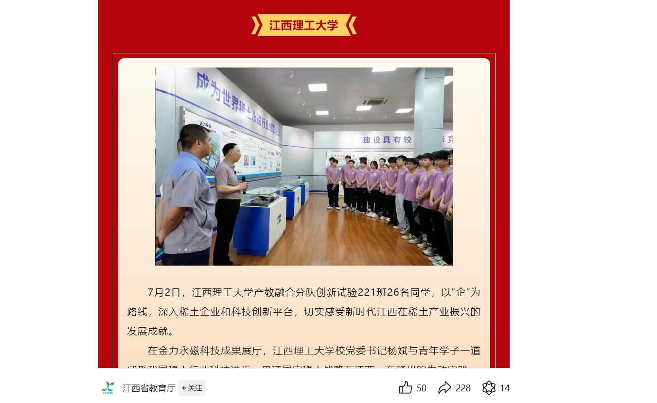 产教融合分队创新试验221班26名同学,以“企”为路线,深入稀土企业和科技创新平台,切实感受新时代江西在稀土产业振兴的发展成就。