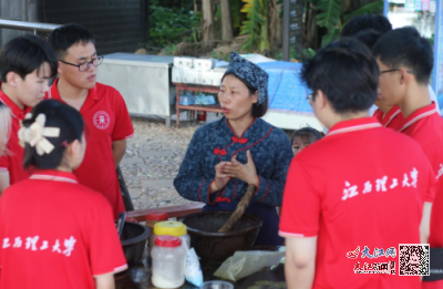 大江网/大江新闻客户端讯(通讯员:李子鹏、于宝添)“老师傅,这客家古文的唱词可有什么特别的讲究”,“大姐,擂茶研磨的力度和节奏是不是也有诀窍呀”,实践队员们充满热情与好奇,像好奇宝宝一样不停追问非遗文化技巧。