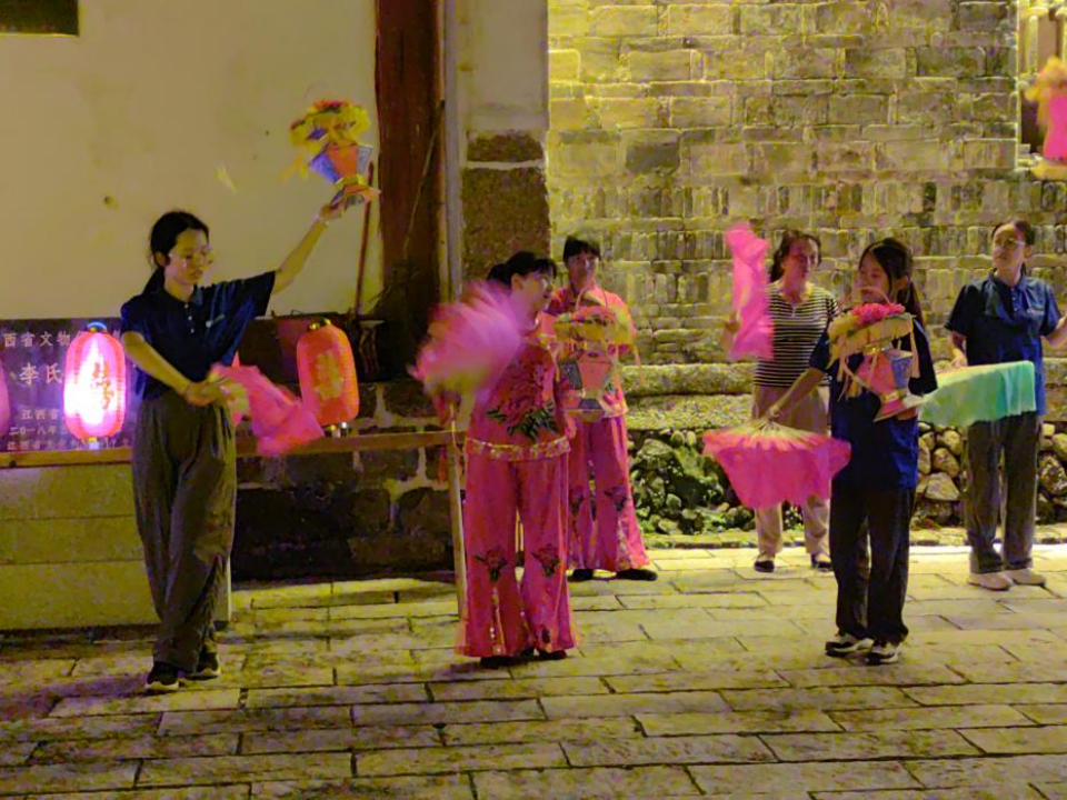 到了村民们最期待的“茶篮灯”表演环节,同学们与村内“茶篮灯”村民表演队“同台竞技”,唱起唱词,挥动彩扇,手托彩灯与观看的村民们不断互动。用最青春、最真挚的“茶篮灯”表演丰富古村村民精神文明世界,让“非遗”文化在青春唱跳中焕发崭新生命力。