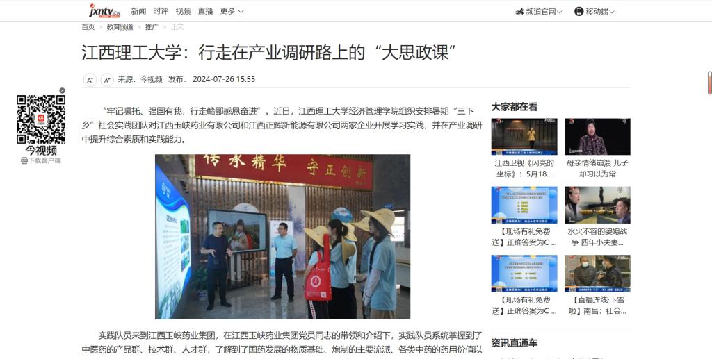 组织安排暑期“三下乡”社会实践团队对江西玉峡药业有限公司和江西正辉新能源有限公司两家企业开展学习实践,并在产业调研中提升综合素质和实践能力。