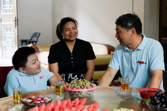 大家围坐在圆桌旁,与昭康父母亲切交谈,了解他的成长经历、身体情况以及遇到的困难,并展望了他即将在江理展开的大学生活。看着通知书上的学校地标,陈昭康嘴角扬起了自信的笑容。
