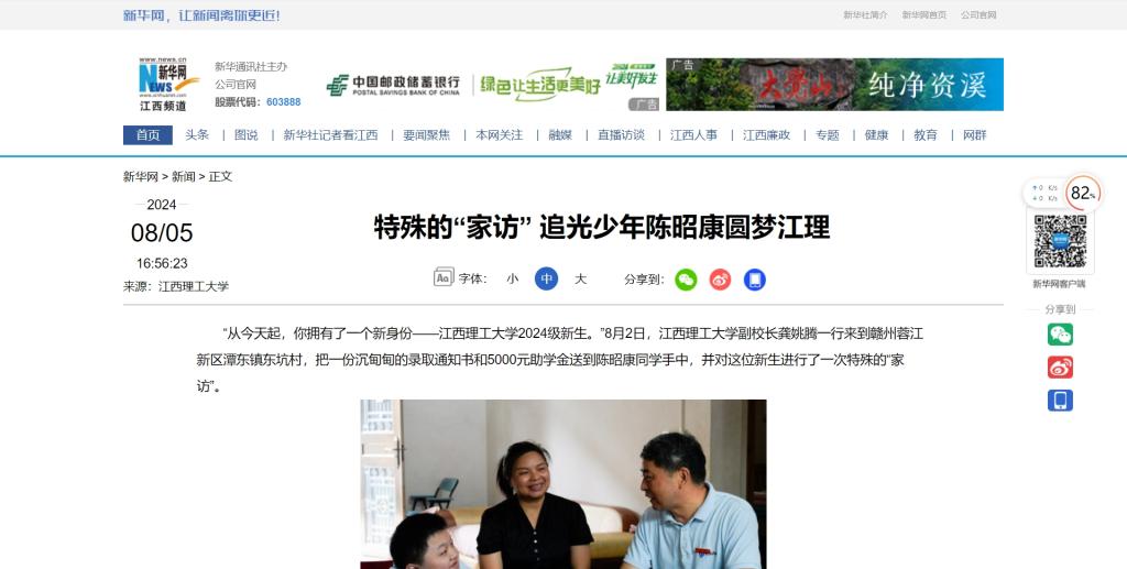 副校长龚姚腾一行来到赣州蓉江新区潭东镇东坑村,把一份沉甸甸的录取通知书和5000元助学金送到陈昭康同学手中,并对这位新生进行了一次特殊的“家访”。