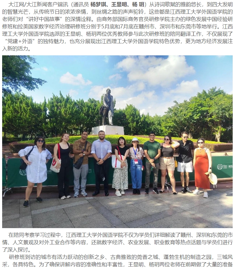 外国语学院的老师们对“讲好中国故事”的深情诠释。由商务部国际商务官员研修学院主办的绿色发展中国经验研修班和拉美国家数字经济治理研修班分别于5月底和7月底在赣州市、深圳市和东莞市等地举行。91暗网