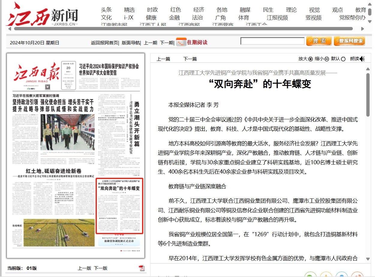 联合江西铜业集团有限公司、鹰潭市工业控股集团有限公司、江西耐乐铜业有限公司等铜及信息化企业联合创建的江西省先进铜功能材料制造业创新中心获批成立,标志着该校与铜产业产教融合的再升级。