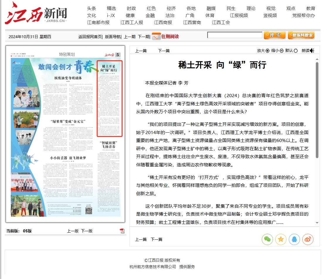龙平博士介绍说,江西是全国重要的稀土产地,离子型稀土资源储量占全国同类稀土资源保有储量的60%以上。在调研中,他还发现离子型稀土矿中的稀土,以离子形式吸附在黏土矿物表面,在传统工艺开采过程中,提炼稀土往往会产生废水、废渣,不仅导致水体氨氮含量偏高,甚至还会伴随着重金属污染,造成周边农作物歉收等现象。
